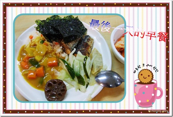 實在是一大早就攝取過多鹽份了,而且海苔的油份也不容小覷,看來昨天的仰臥起坐真的只是做心安的~