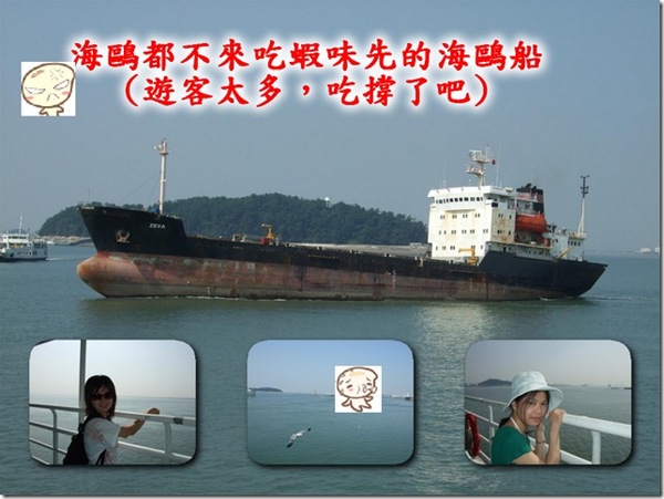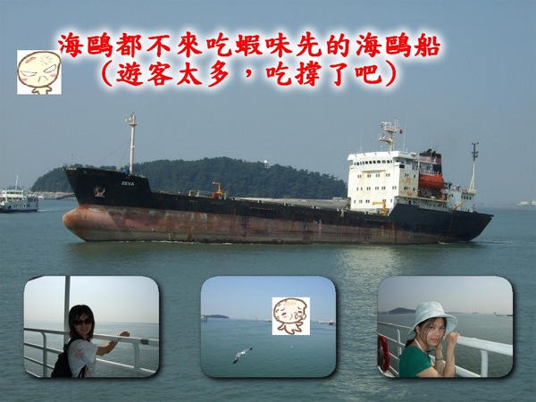我們上了船,拿著照相DD發給我們的蝦味先,準備餵海鷗,誰知這群笨鳥連靠近一些分食都懶,只不斷地在離船邊N尺遠處旋身低飛。