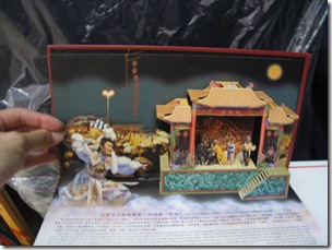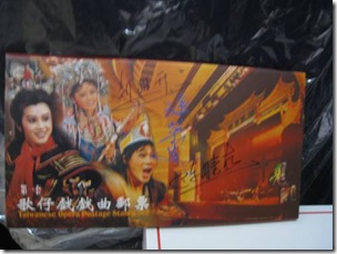 鑑於上次等了半天別說吭聲連靠近都不敢靠近的俗辣經驗,我跟阿娃底定這次一定至少要讓孫小姐看到我們兩個。於是同上一般,散戲後,我們興奮地跟著一大票人到後台等著本尊出現。等待之時,看到文化小鋪有開張,我一直懊悔著沒能把項羽大帥哥”帶”回家,所以馬上衝向前看還有沒有機會,結果,我跟那件T-Shirt還是緣懢一面,不過倒是讓我發現另一件寶──那就是照片中的「歌仔戲戲曲收藏郵票」!收藏組中有4張郵票,還有歌仔戲簡史跟立體紙雕,一套良心價NT200;雖然我一向不喜歡「收藏」(DVD另當別論,至少它有”實質”價值),看到項羽大帥哥傾人國城的微笑印在封面向我招手,我也只好掏出$$帶他回家了。