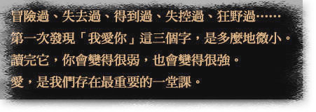 憑著好奇心,我再次咀嚼了這本以幾乎與人類文明同進的主題─愛─為軸心延展的黑皮書(探討愛的書卻選擇黑色當襯底,可見作者頗具匠心吶)
